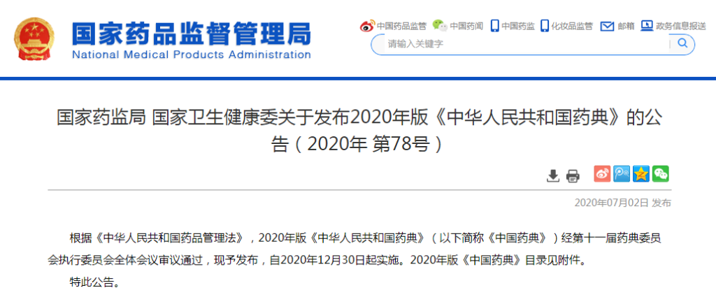 7月2日,國家藥品監(jiān)督管理局、國家衛(wèi)生健康委發(fā)布公告,正式頒布2020年版《中華人民共和國藥典》(以下簡稱《中國藥典》)。新版《中國藥典》將于今年12月30日起正式實施。