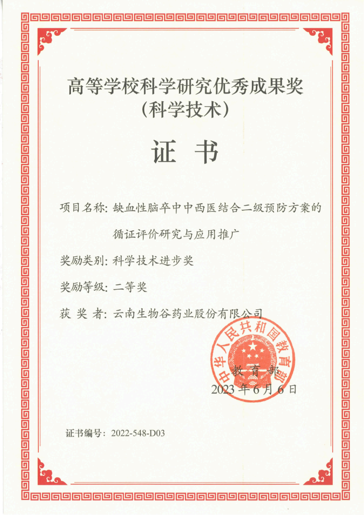 近日,2022年度國家高等學??茖W研究優(yōu)秀成果獎(科學技術)獎項評定頒布,由廣州中醫(yī)藥大學牽頭、云南生物谷藥業(yè)股份有限公司聯(lián)合共同完成的“缺血性腦卒中中西醫(yī)結合二級預防方案的循證評價研究與應用推廣”項目榮獲國家教育部科學技術進步獎二等獎,這是本年度廣州中醫(yī)藥大學唯一牽頭獲得該獎項的項目,也是我公司首度與高??蒲袡C構研發(fā)合作獲得教育部重大獎項。
